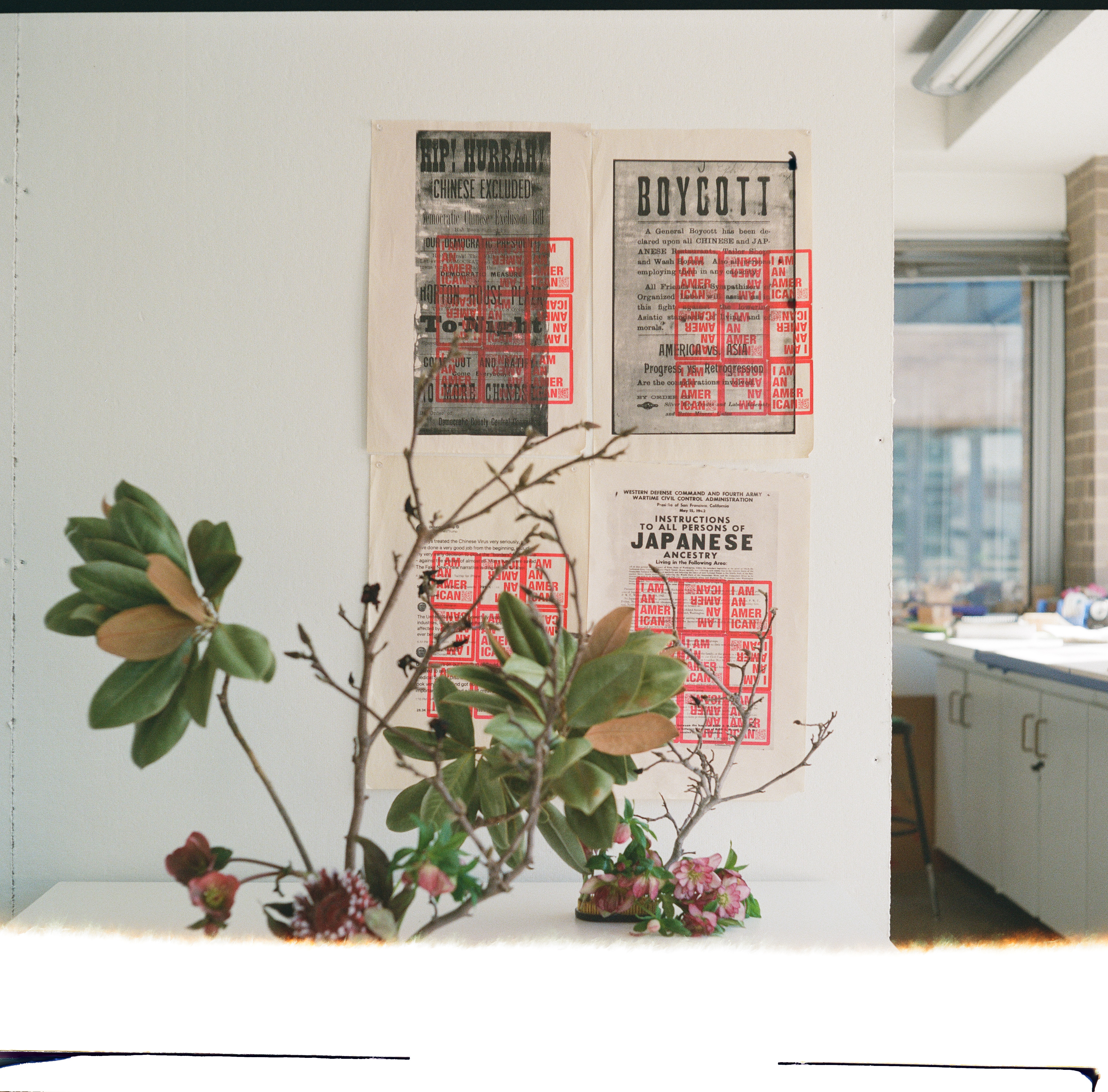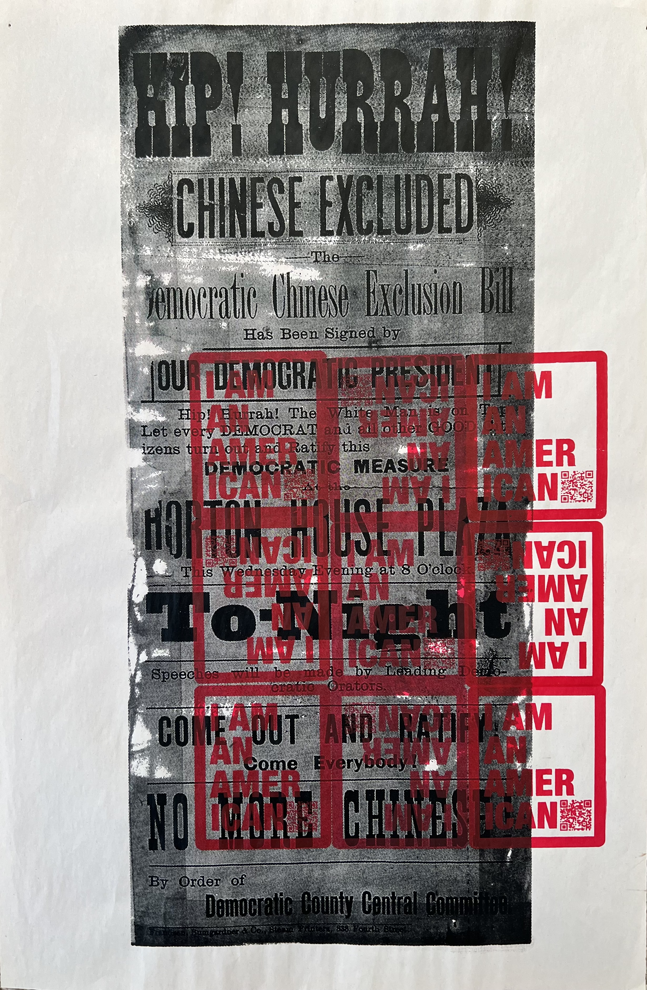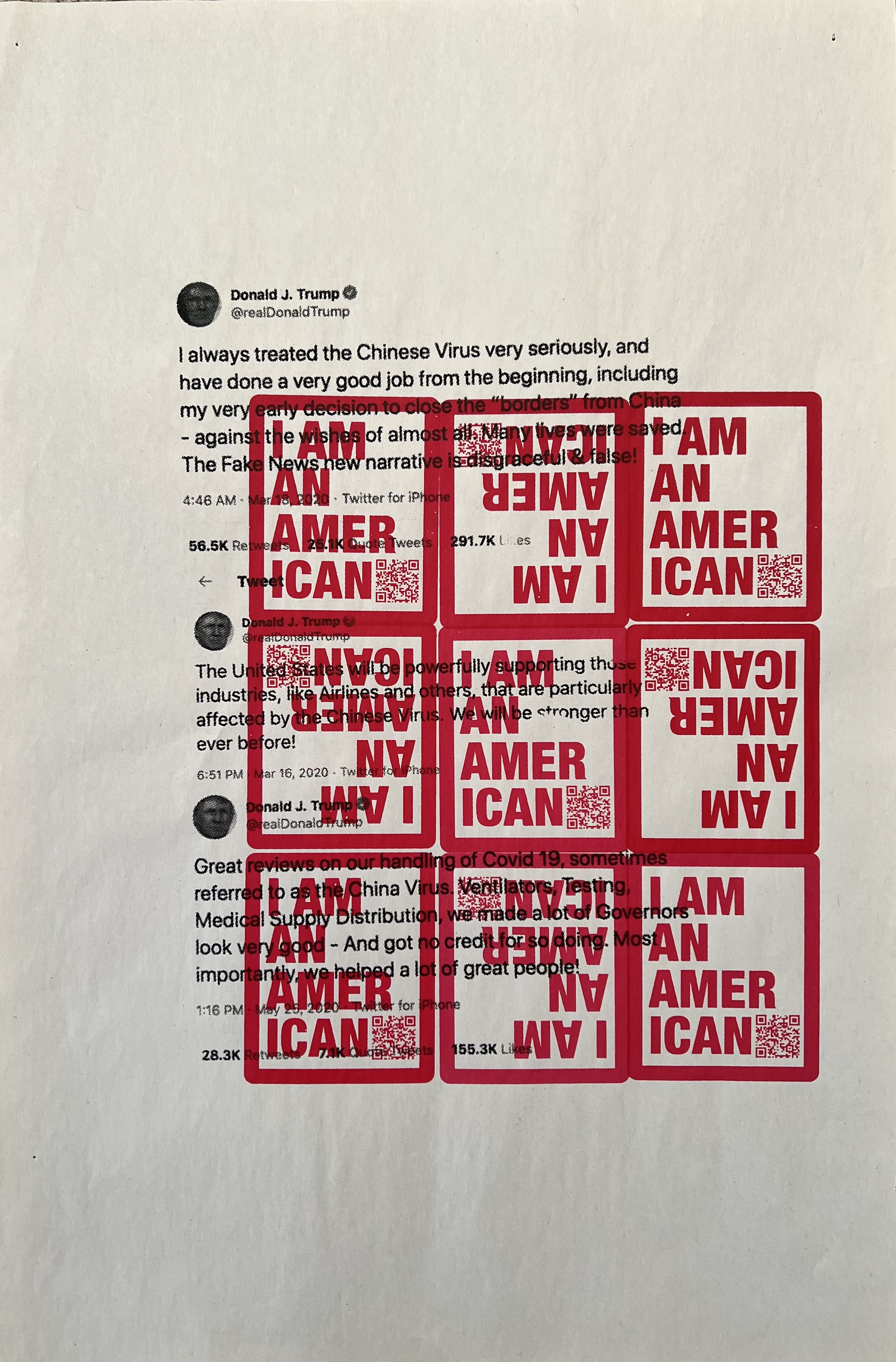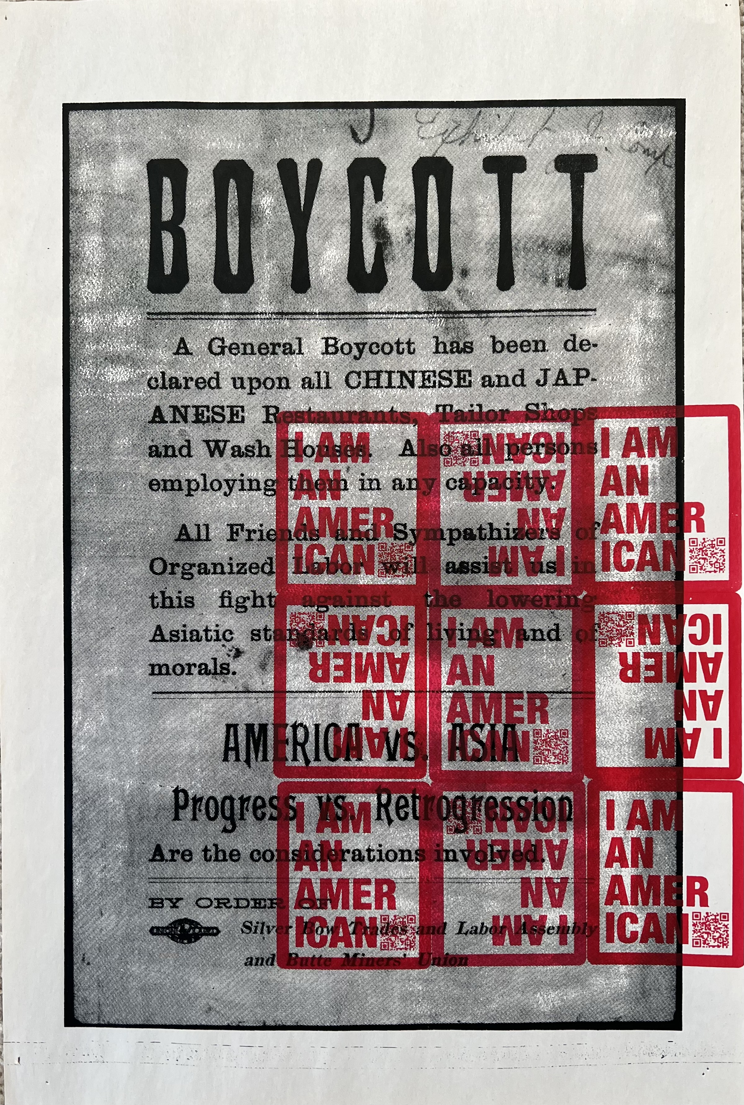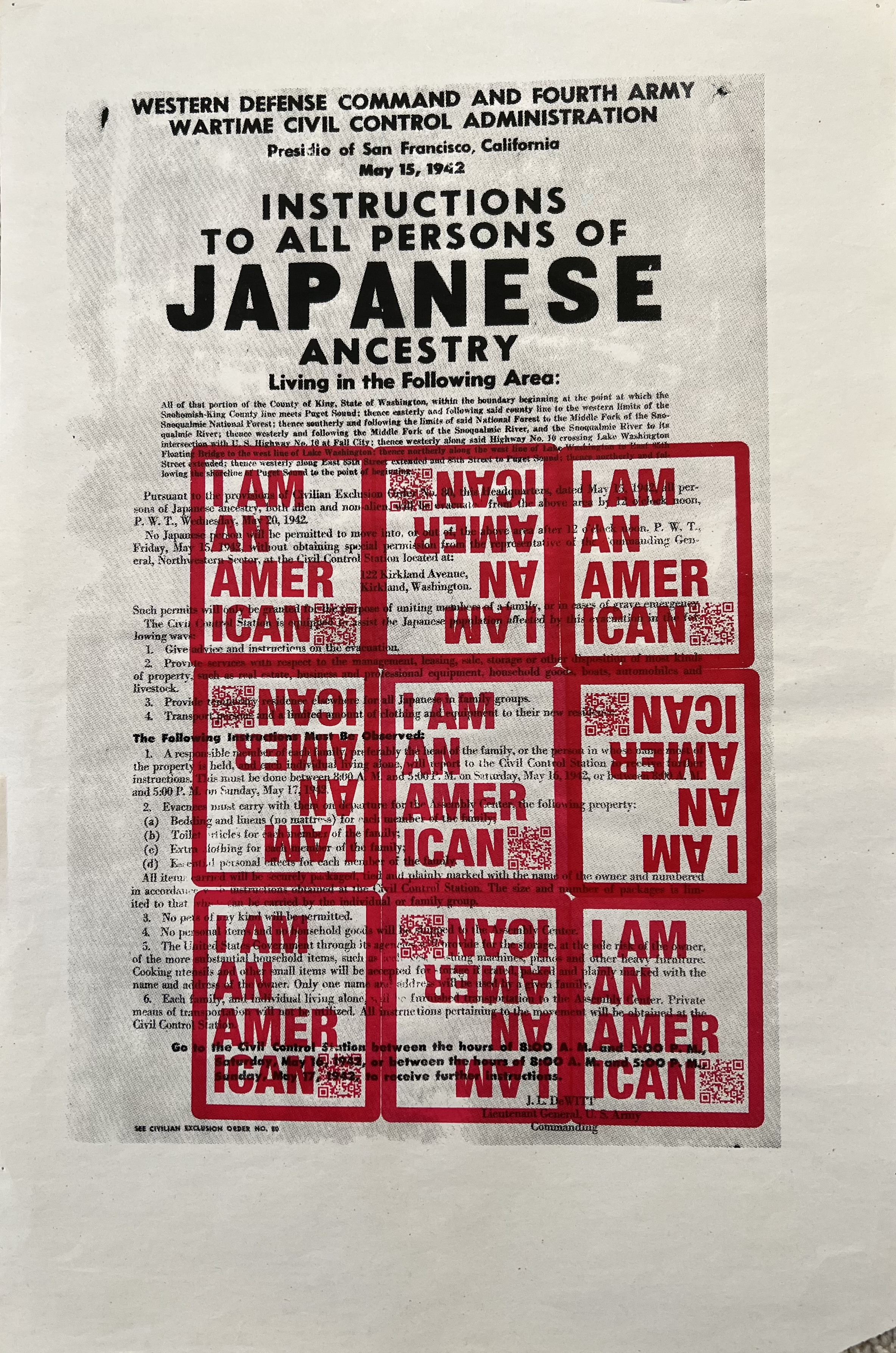 Inspired by the photograph by Dorothea Lange taken in 1942, where “I AM AN AMERICAN” was displayed on a storefront in Oakland, CA the day after the Pearl Harbor attacks and the internment order, I recreated historic accounts of xenophobic print in America and then screenprinted “I AM AN AMERICAN” across them in the form of the Korean dojang.