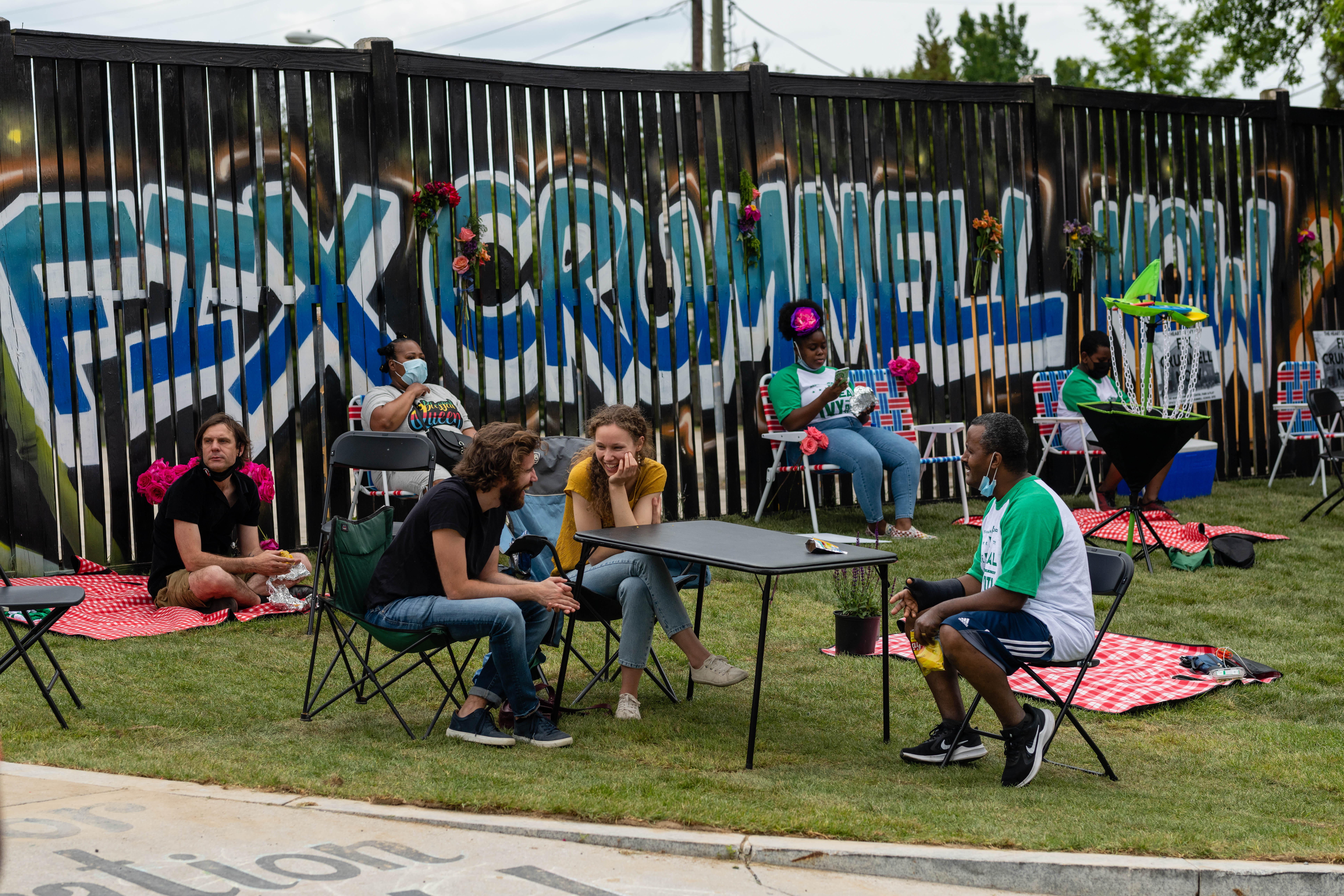 The pop-up park included over 3,000 flower stems and over 1,300 sq ft of sod within a neighborhood block party.